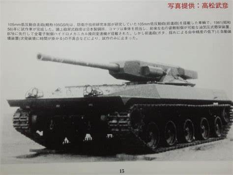 コマツが試作した軽量の対戦車自走砲。車体は60SPRGベースなので恐らくその後継を狙ったものだと思われる。 この車両の特筆すべき点は、主砲のメカニズムだろう。この105mm低反動砲の駐退復座機構は独特で、前進砲というものに分類される。 前進砲では、一般の砲でいう後座した状態が射撃前の待機状態で、そこから復座する過程で撃発する。すると復座中の砲身の慣性力と、砲弾の反動が相殺され、車体へ伝わる衝撃が大幅に抑制される。 これにより、105GSRではバックブラストやカウンターマスを利用したり、専用の弱装弾を使うことなく、車体規模に比して強力な主砲を搭載することに成功している。 ただし、砲身が固定されない状態で砲弾を発射する以上、あまり精度を期待できないという宿命を背負っている。 また画像にあるとおり、油気圧式懸架装置による姿勢制御にも対応していたり、自動装填装置(あまり性能は良くなかったようだが)を搭載していたり、小さな車体に意欲的な機能を盛り込んだ車両だったが、前進砲の精度不足や自動装填装置の不具合により採用されることなかった。